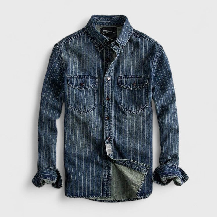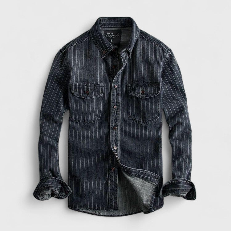 Bold vertical stripes meet rugged denim with a lived-in fade, giving you a standout shirt that works solo or as an overshirt. A button-front, long sleeves, and a clean slim profile keep the lines sharp in black or peacock blue.