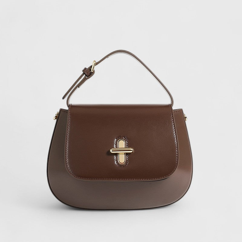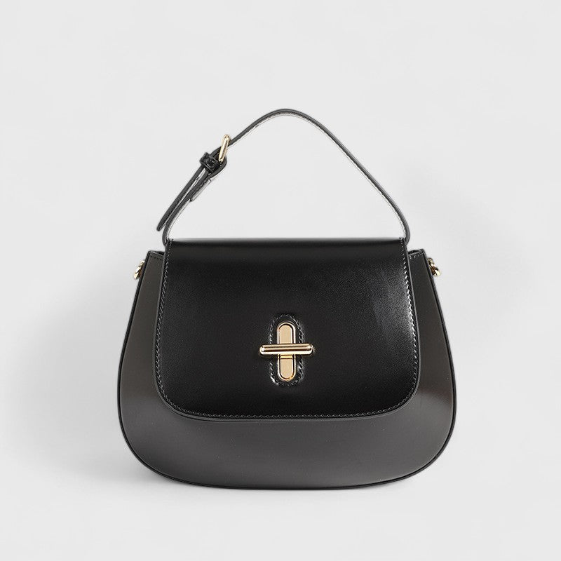Sleek oval crossbody crafted from genuine leather, shaped with a structured silhouette and a secure turn-lock flap.